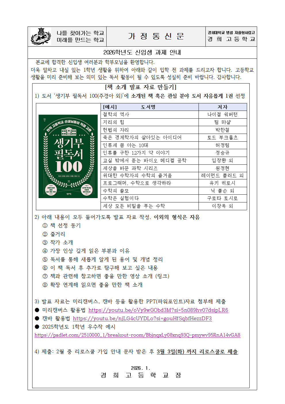 2026학년도 신입생 입학 전 과제 안내