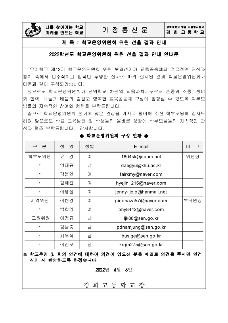 학교운영위원회 제172차 임시회(2022-4회) 회의 개최 결과 안내