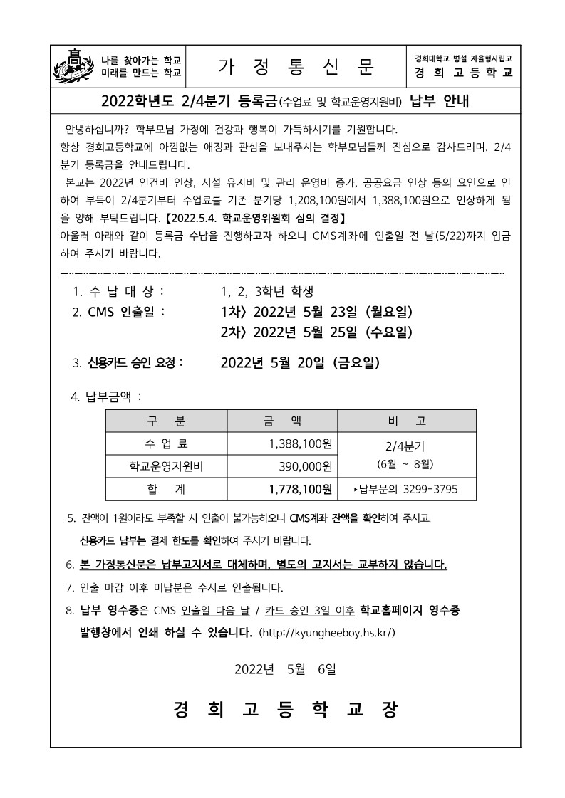 2022학년도 2/4분기 등록금 안내