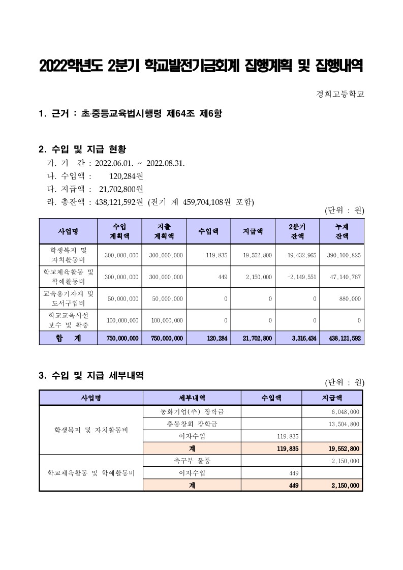 2022학년도 2분기 학교발전기금회계 집행계획 및 집행내역