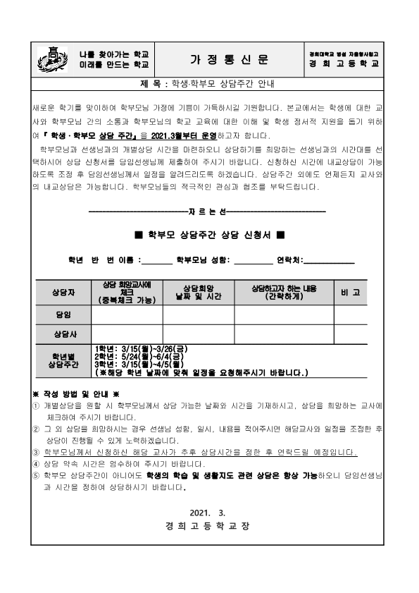 3학년은 대입관련 상담시 이전에 안내된 3학년 학부모 상담신청 가정통신문으로 작성해 보내주시기 바랍니다.