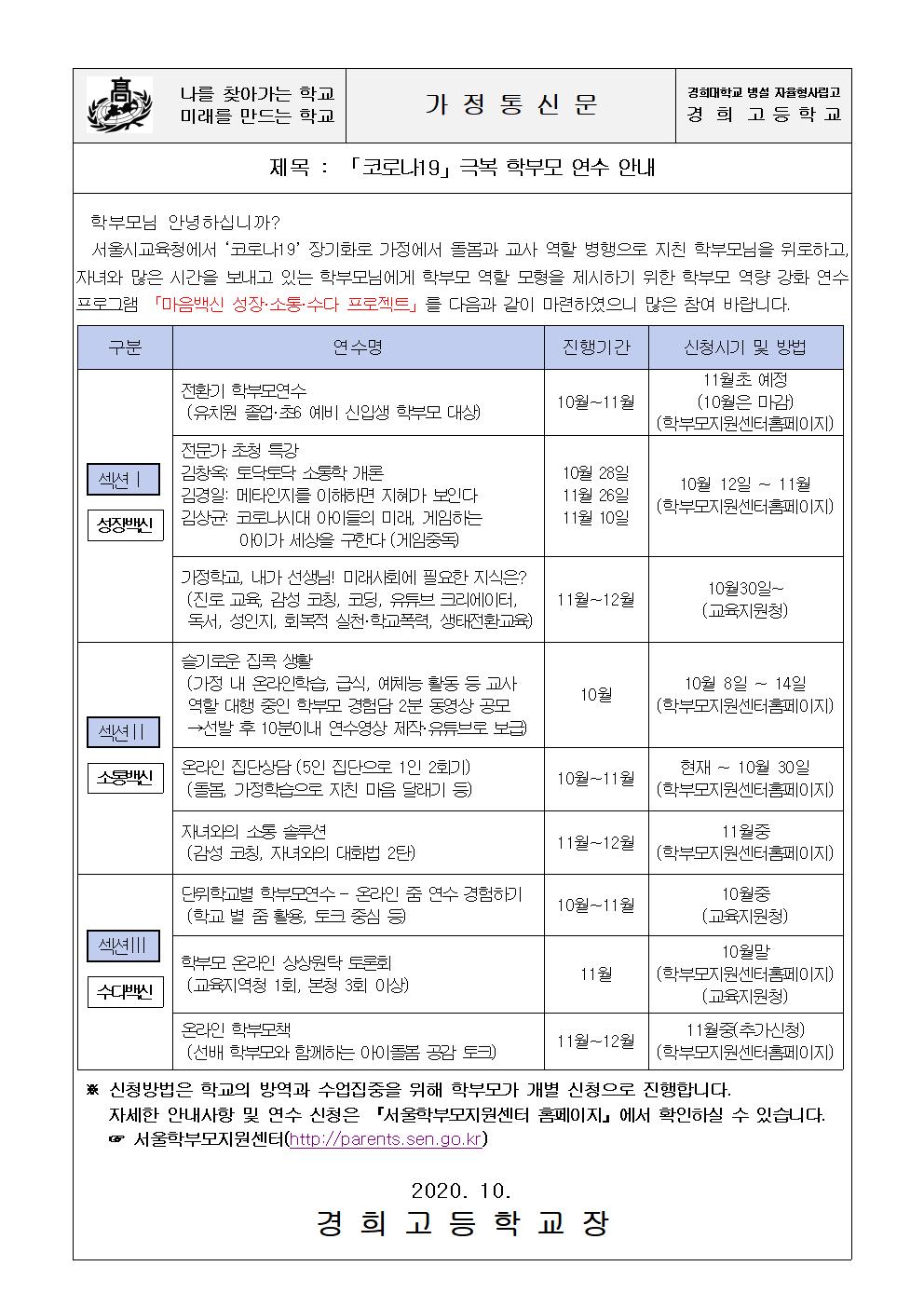 「코로나19」극복 학부모 연수 안내 작성자 : 학교관리자 조회 : 1866회 작성일 : 2020.10.14 12:58 신고 인쇄 스크랩 (가정통신문)「코로나19」극복 학부모 연수 안내.jpg (239.5KB) (12) (가정통신문)「코로나19」극복 학부모 연수 안내.hwp (273.5KB) (90) 수정 답변 삭제 목록으로 댓글 0개 | 엮인글 0개