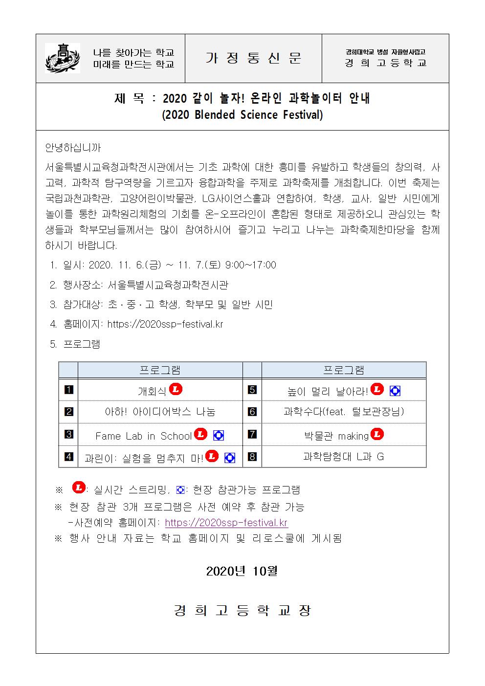 제17회 서울융합과학축제 '2020 같이 놀자! 온라인 과학놀이터' 행사 안내 작성자 : 창의체험부 조회 : 1654회 작성일 : 2020.10.23 13:19 신고 인쇄 스크랩 제17회 서울융합과학축제 2020 같이 놀자! 온라인 과학놀이터 행사 안내.jpg (177.4KB) (17) 수정 답변 삭제 목록으로 댓글 0개 | 엮인글 0개