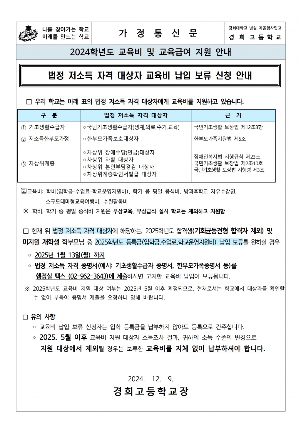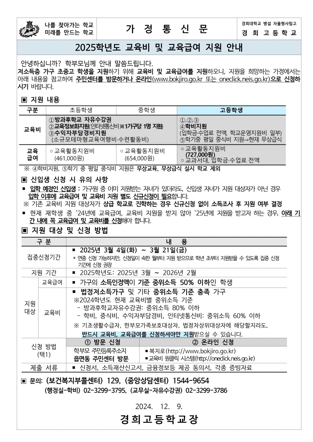 2025학년도 교육비 및 교육급여 지원 안내
