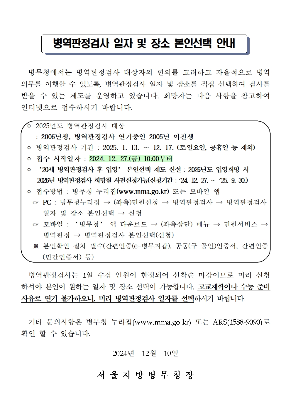 2025년도 병역판정검사 일자 및 장소 본인선택 안내