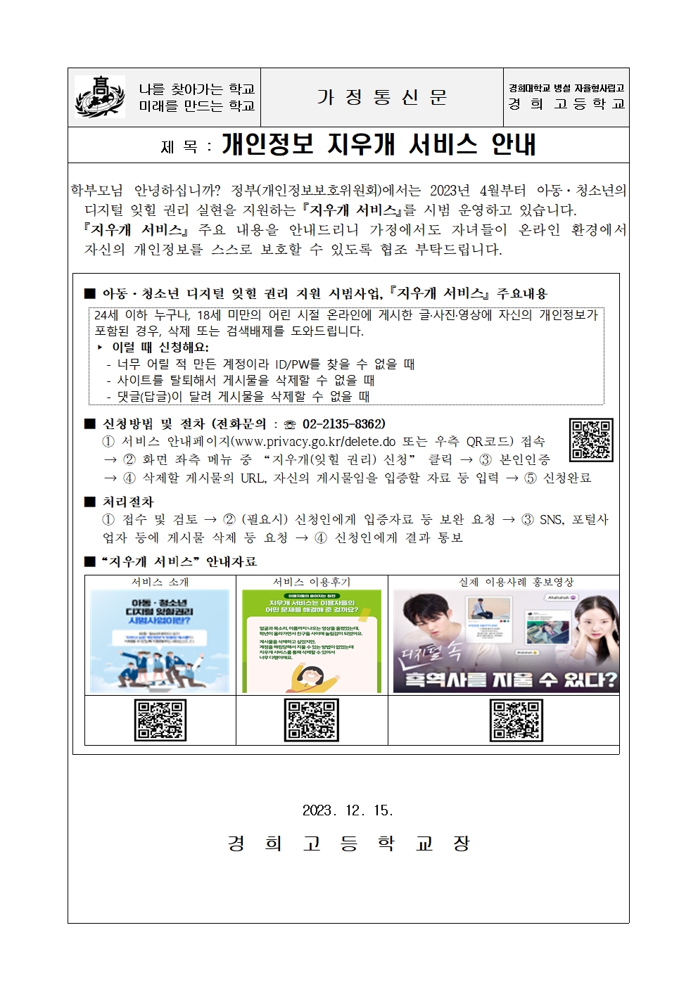 개인정보 지우개 서비스 안내 가정통신문