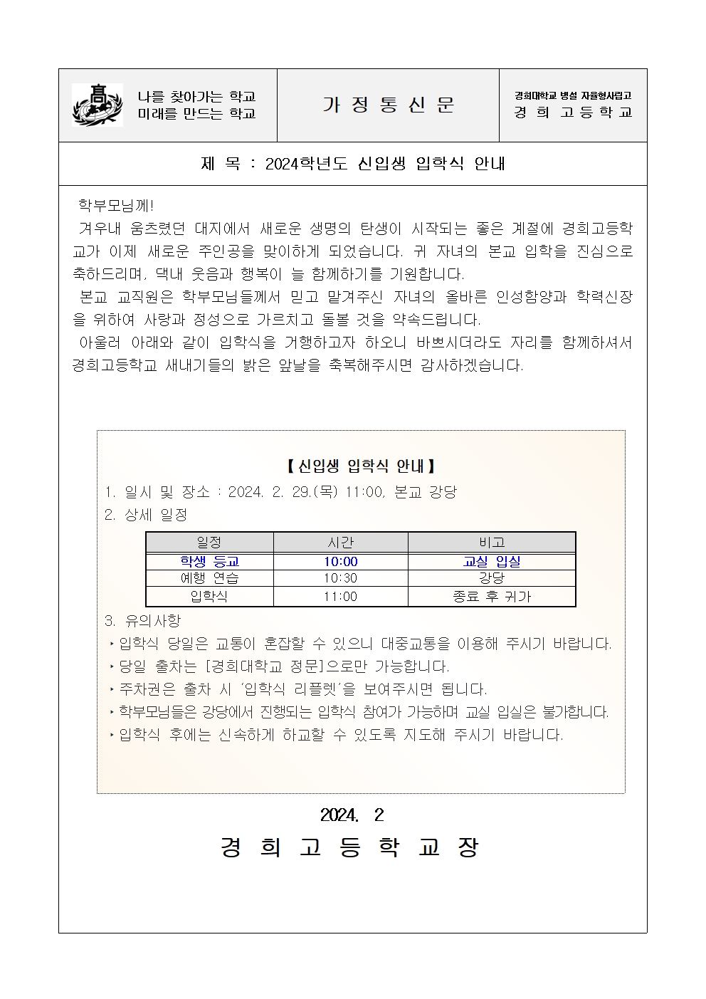 2024학년도 입학식 안내 가정통신문