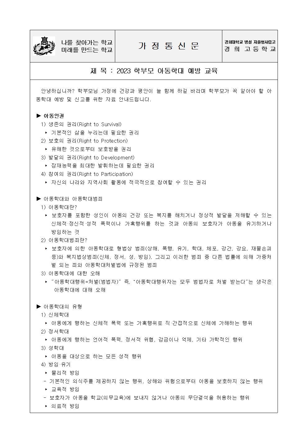 2023학년도 학교폭력 예방 안내 가정통신문(6호)