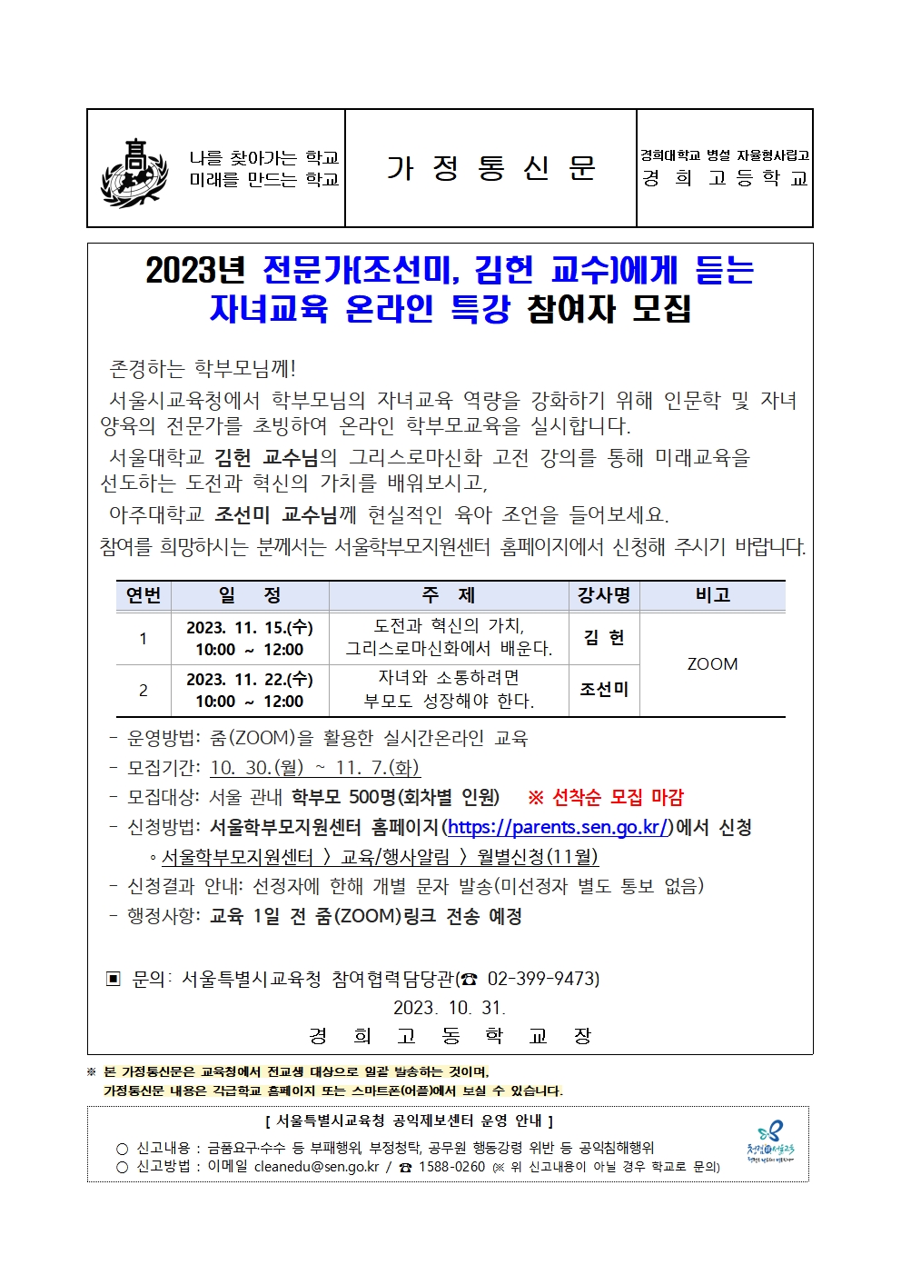 - [경희고등학교-13332 (첨부) 서울특별시교육청 참여협력담당관] 2023년 전문가에게 듣는 자녀교육 온라인특강 웹포스터.jpg (213.7KB) (13)