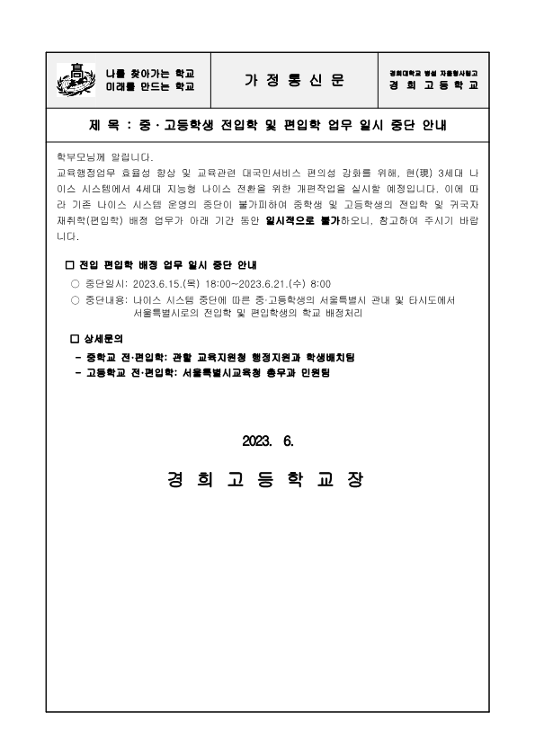 4세대 나이스 이관에 따른 중·고등학교 전·편입학 업무 일시 중단 안내 가정통신문 발송