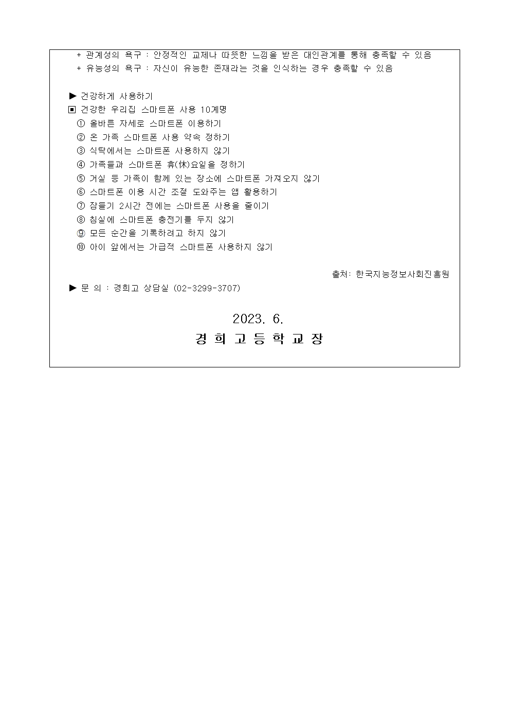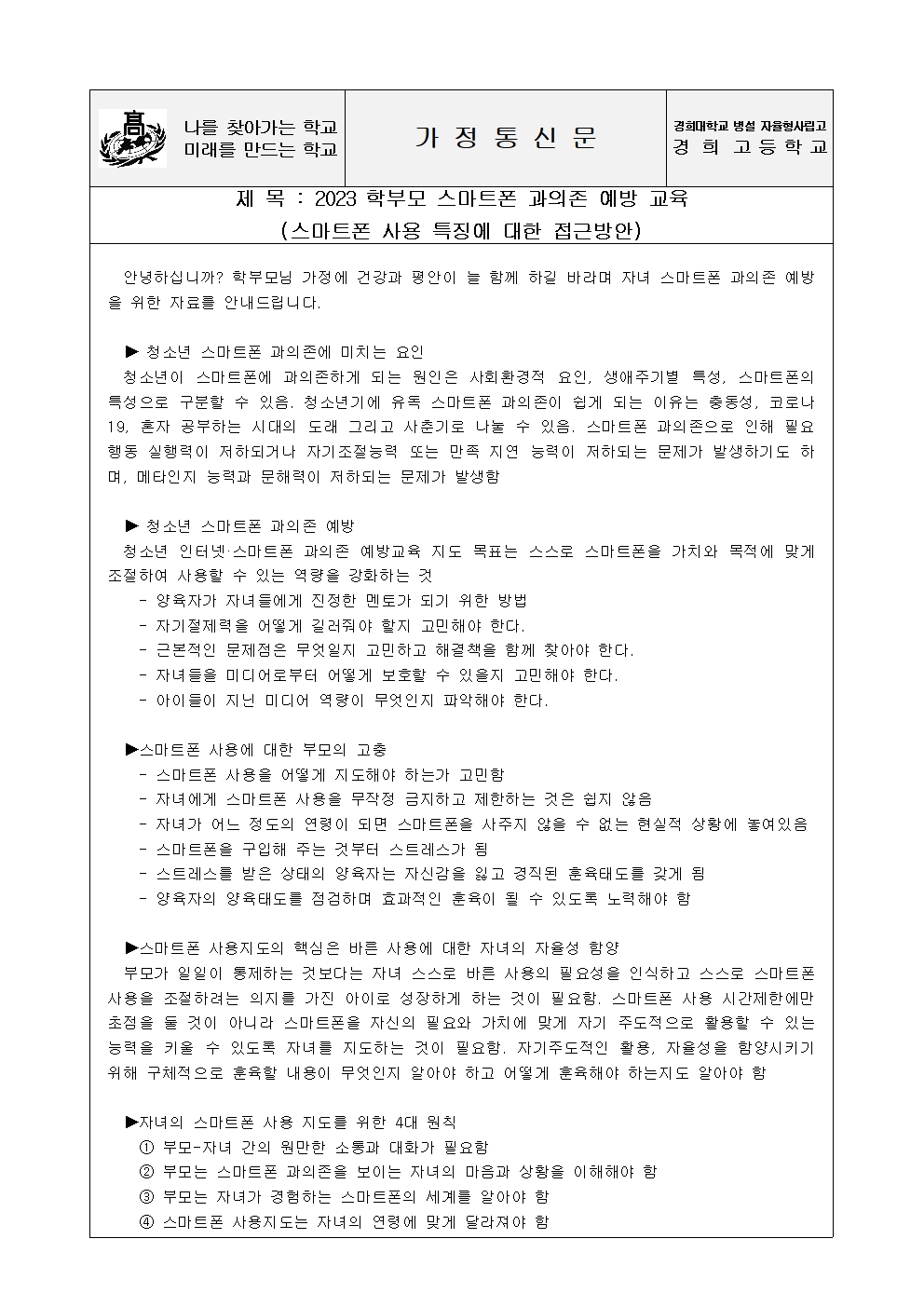2023 학부모 스마트폰 과의존 예방 교육 가정통신문