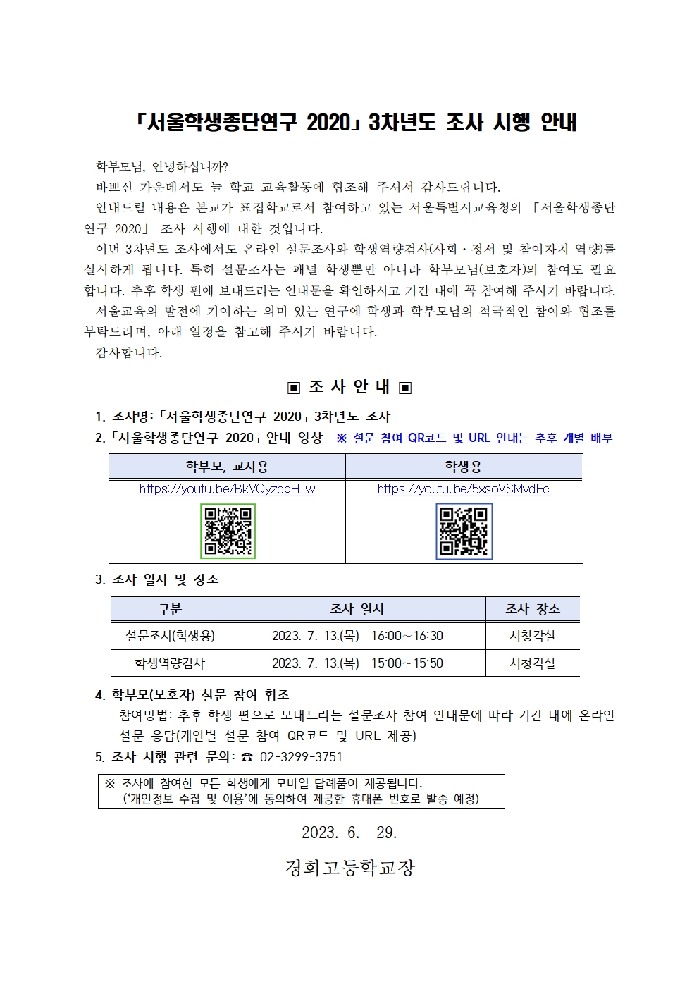 「서울학생종단연구 2020」3차년도 조사 시행 안내