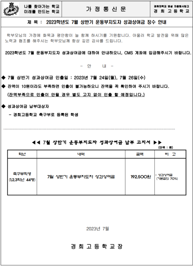 2023학년도 7월 상반기 운동부지도자 성과상여금 징수 안내문(축구부)