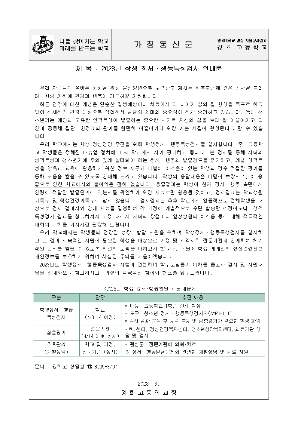 2023년 학생 정서·행동특성검사 안내 가정통신문