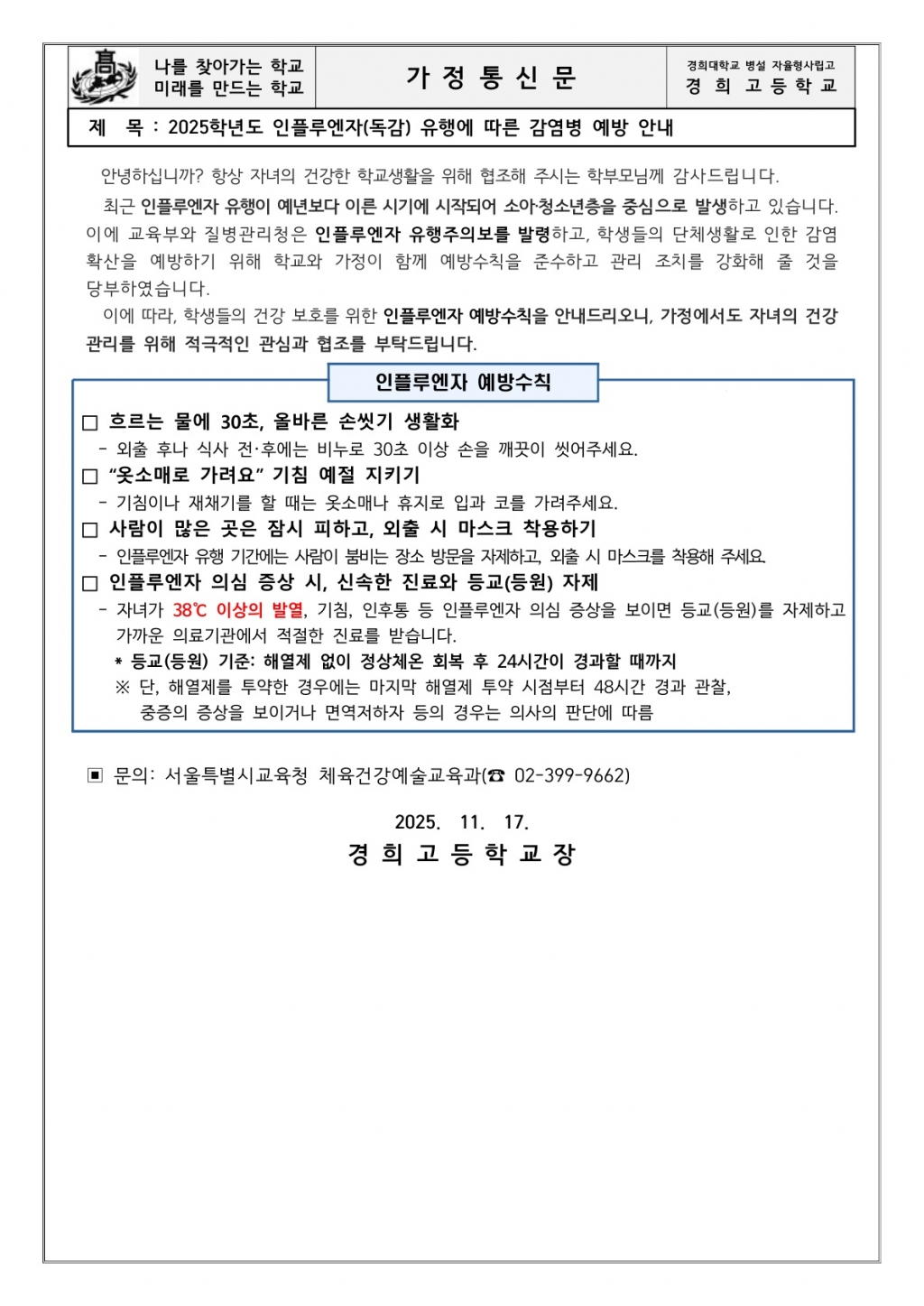 2025학년도 인플루엔자(독감) 유행에 따른 감염병 예방 안내