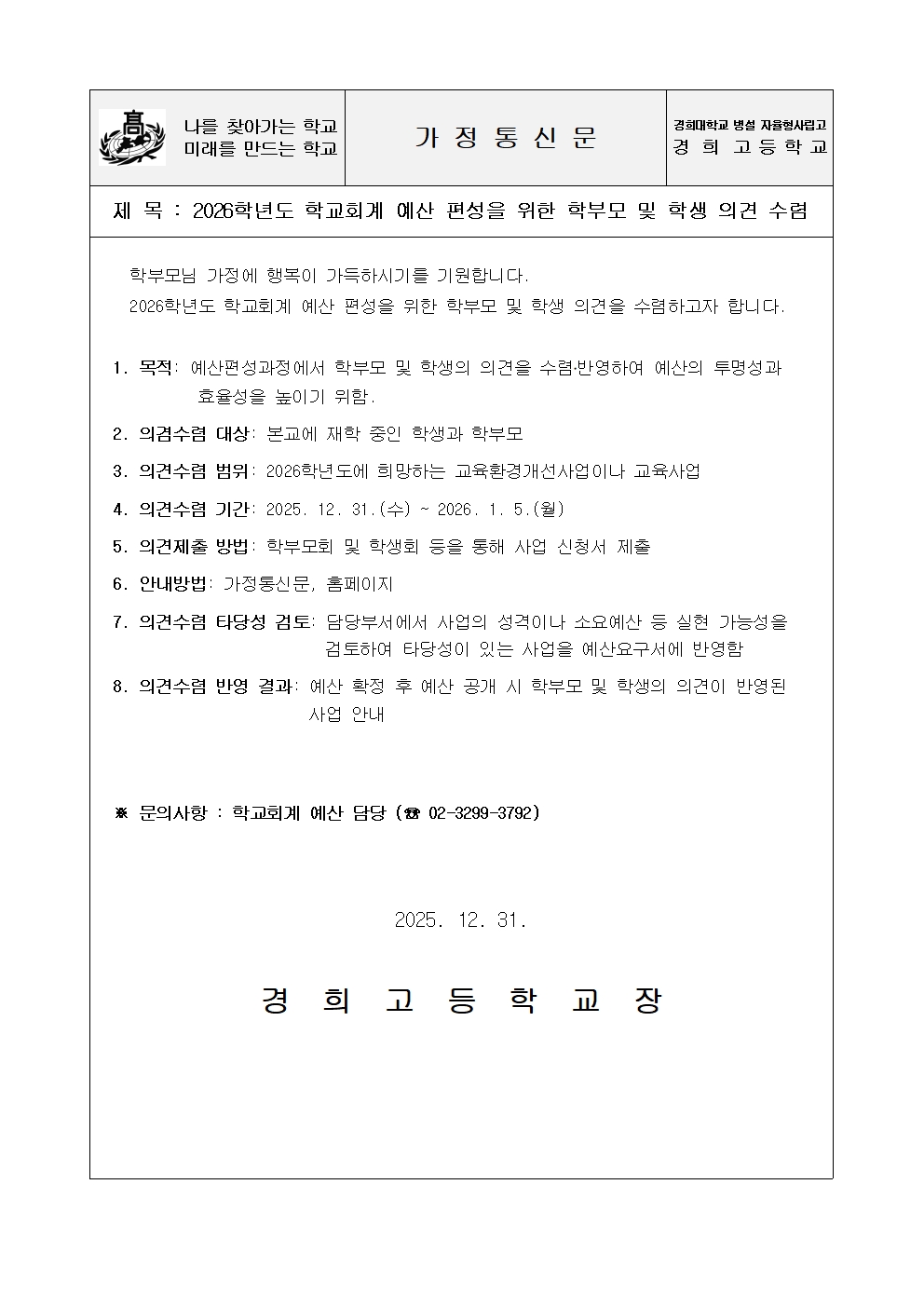 2026학년도 학교회계 예산 편성을 위한 학부모 및 학생 의견 수렴
