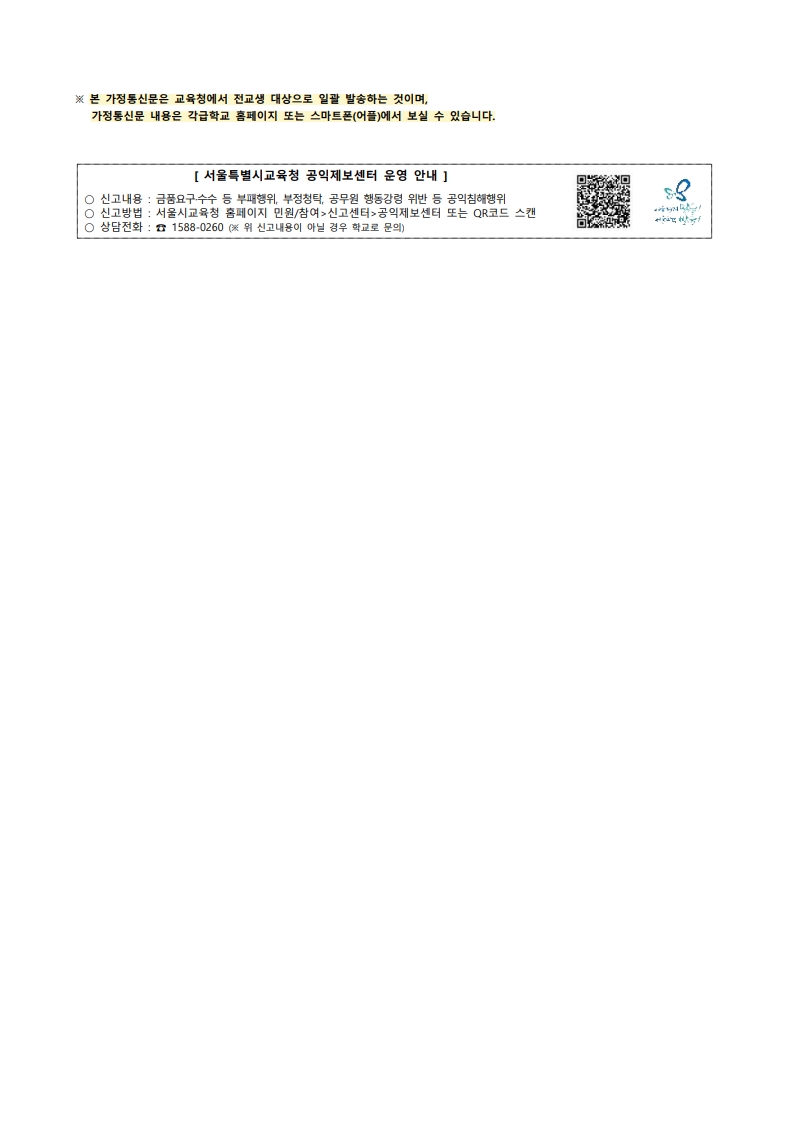 「운동부 학부모 대상 청렴 모니터링 참여 안내」 (서울특별시교육청)