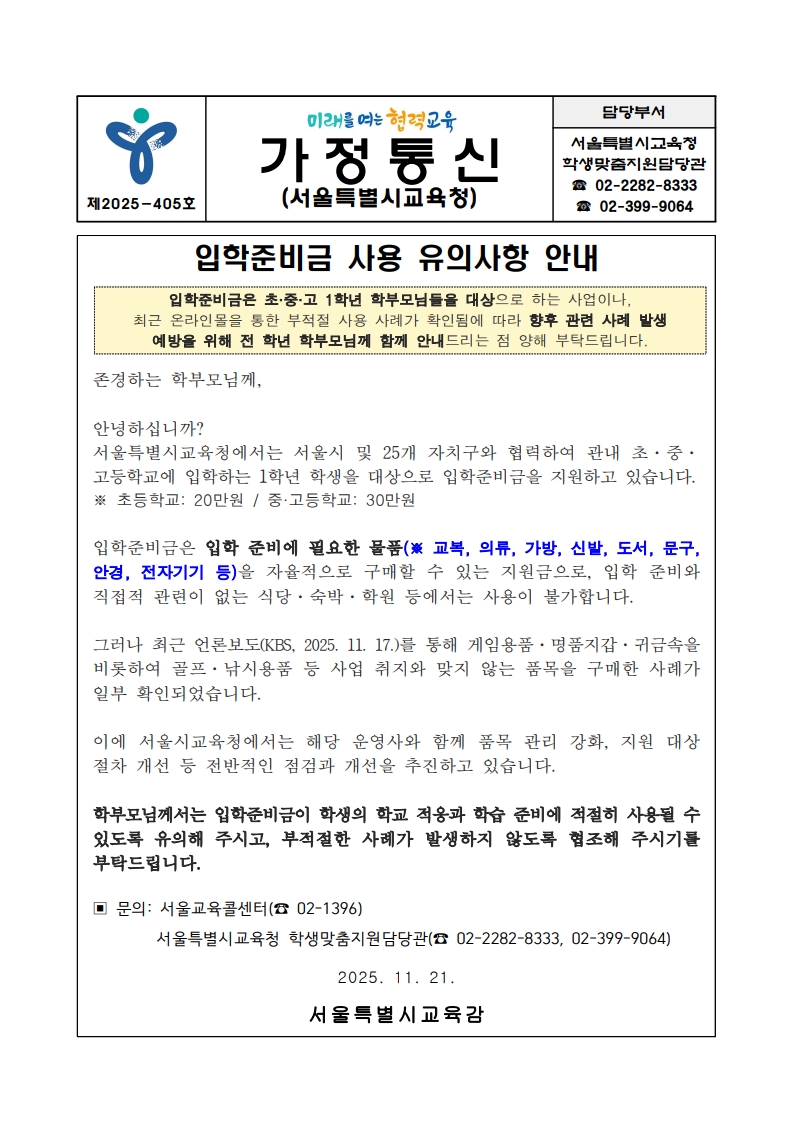 입학준비금 사용 유의사항 안내