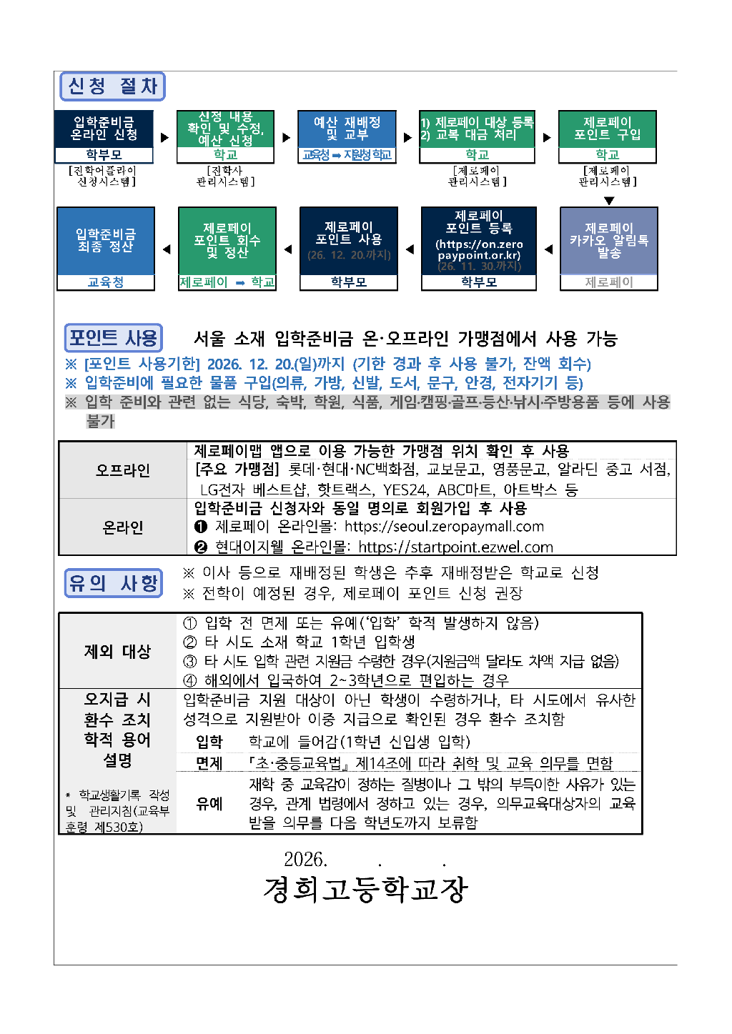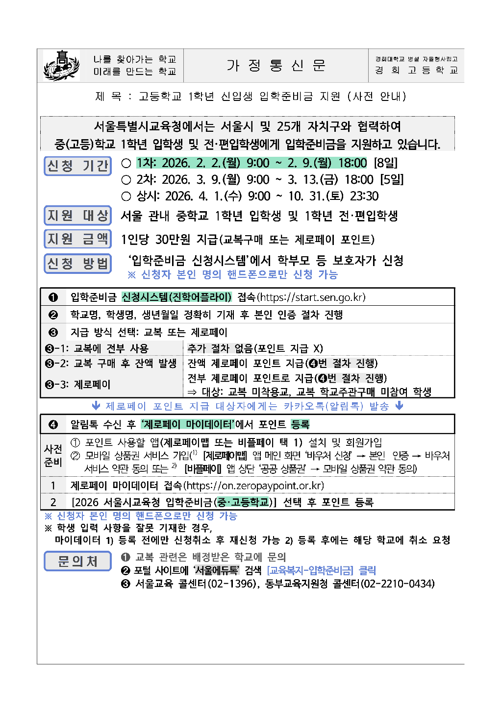 경희고등학교 1학년 신입생 입학준비금 지원 안내
