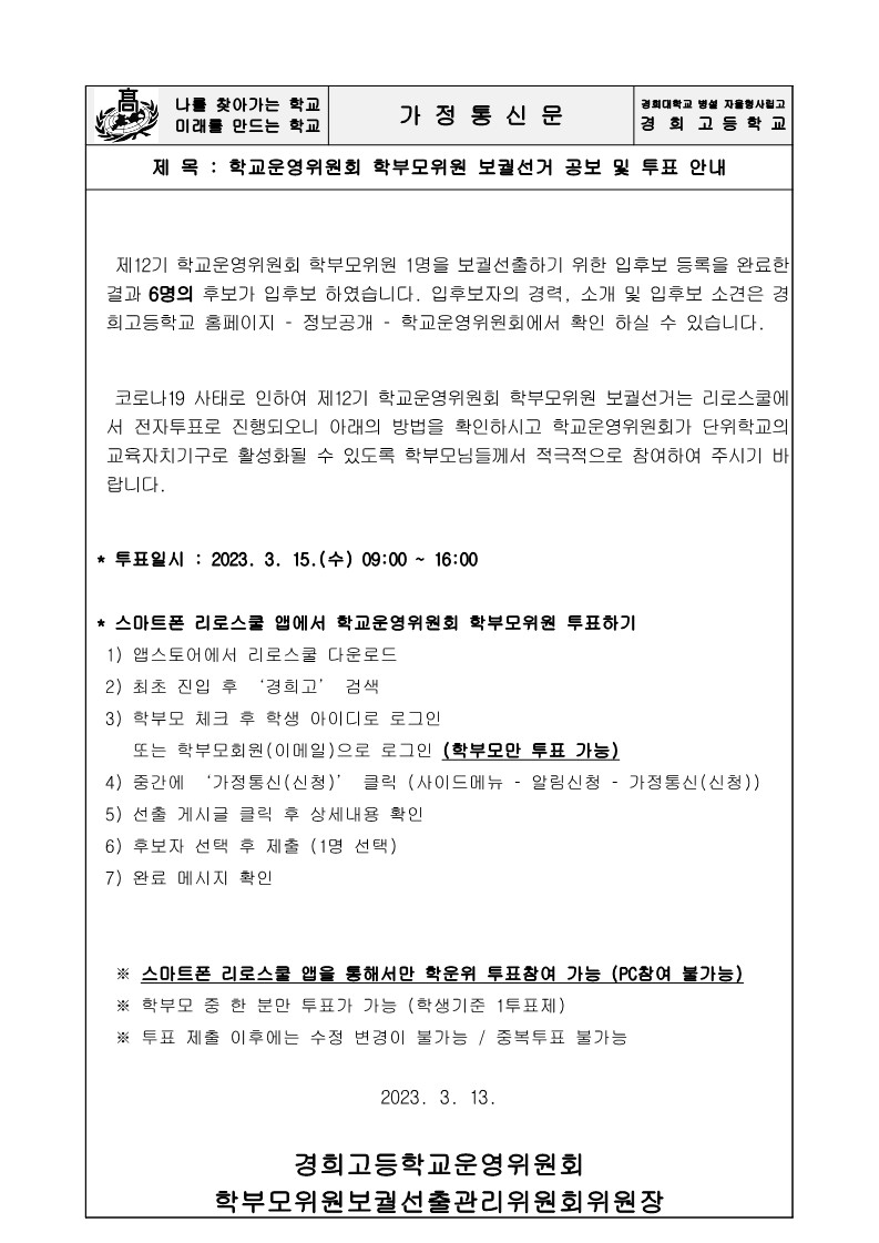 제12기 학교운영위원회 학부모위원 보궐선출 공보 및 투표 안내