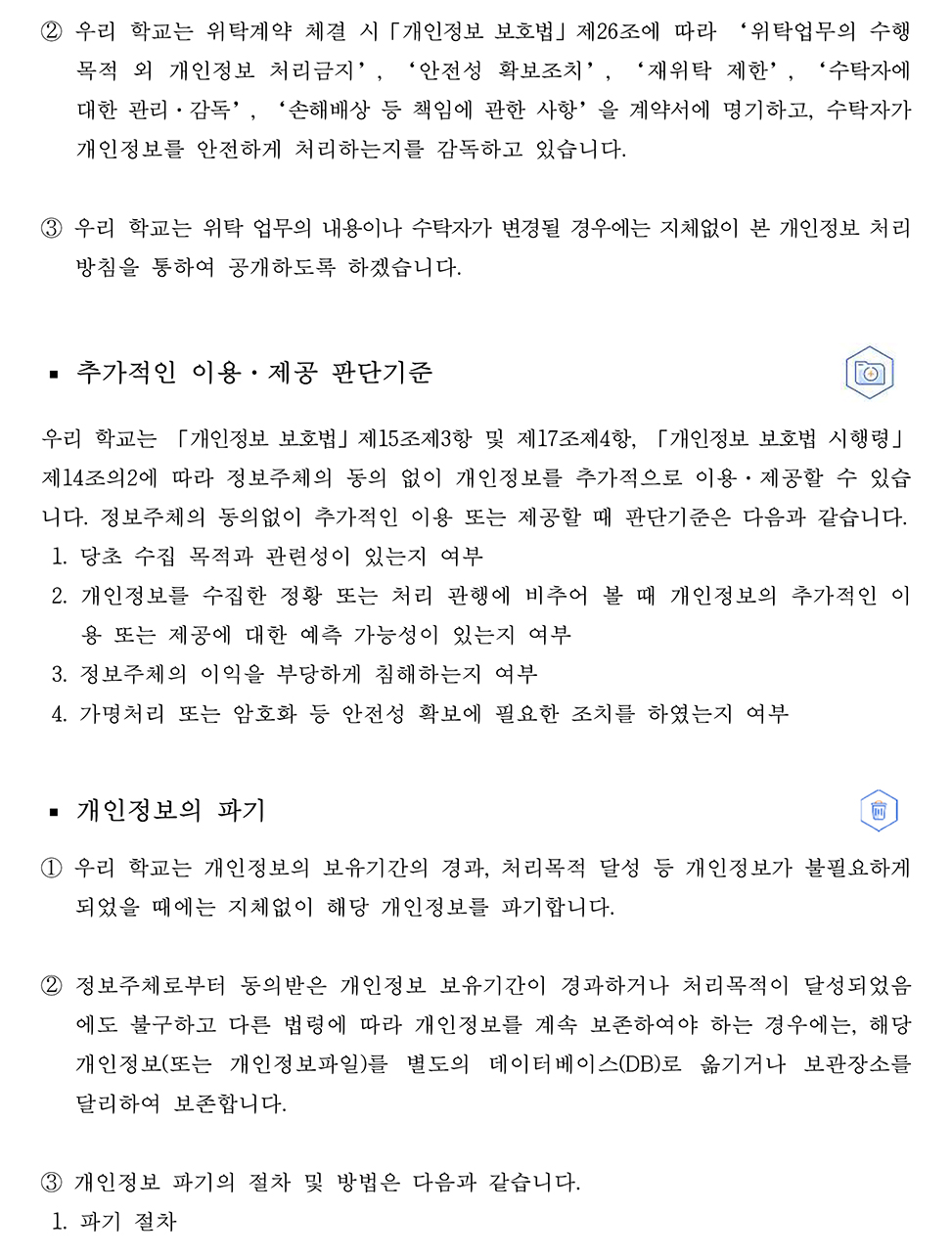 제3조. 개인정보처리의 위탁 경희고등학교는 개인정보의 처리 업무를 위탁하는 경우 다음의 내용이 포함된 문서에 의하여 처리하고 있습니다. |