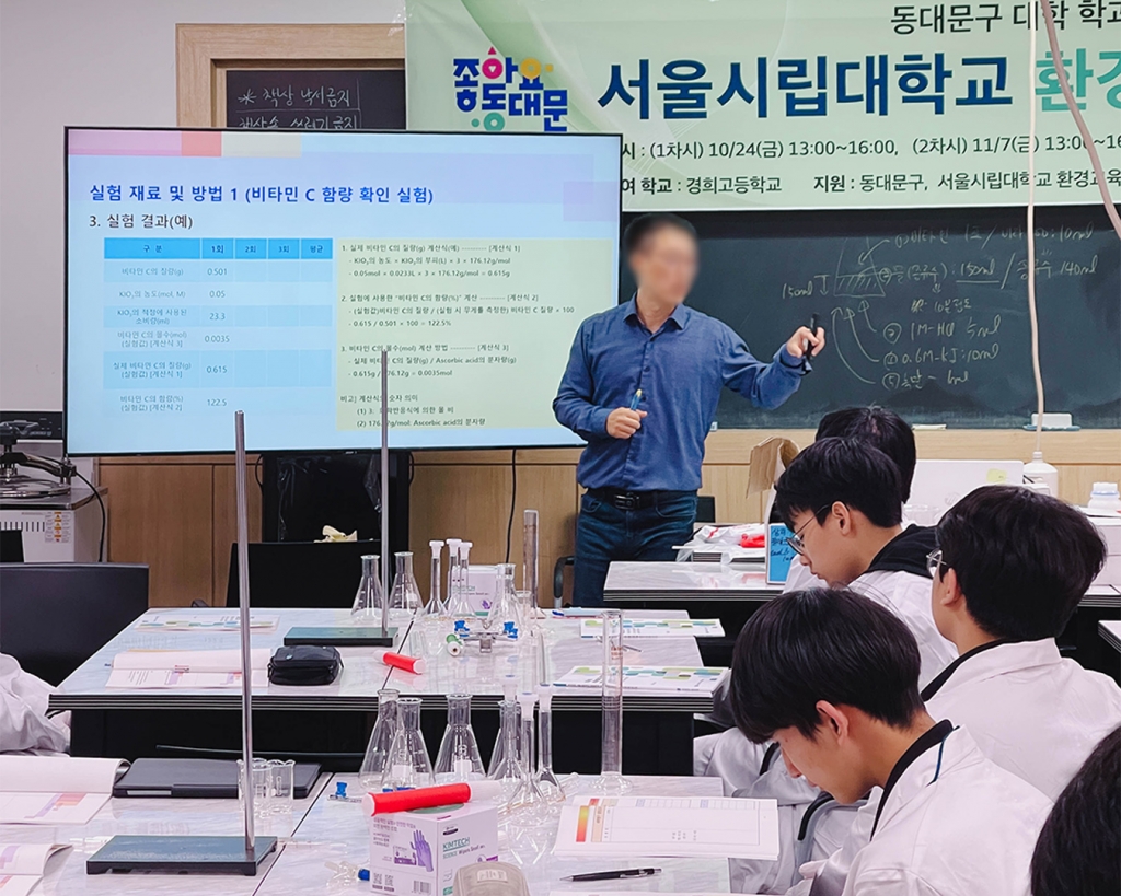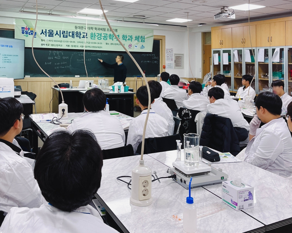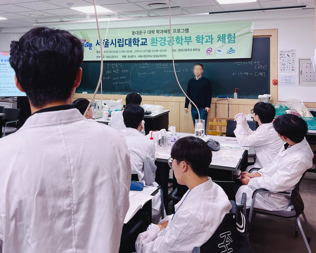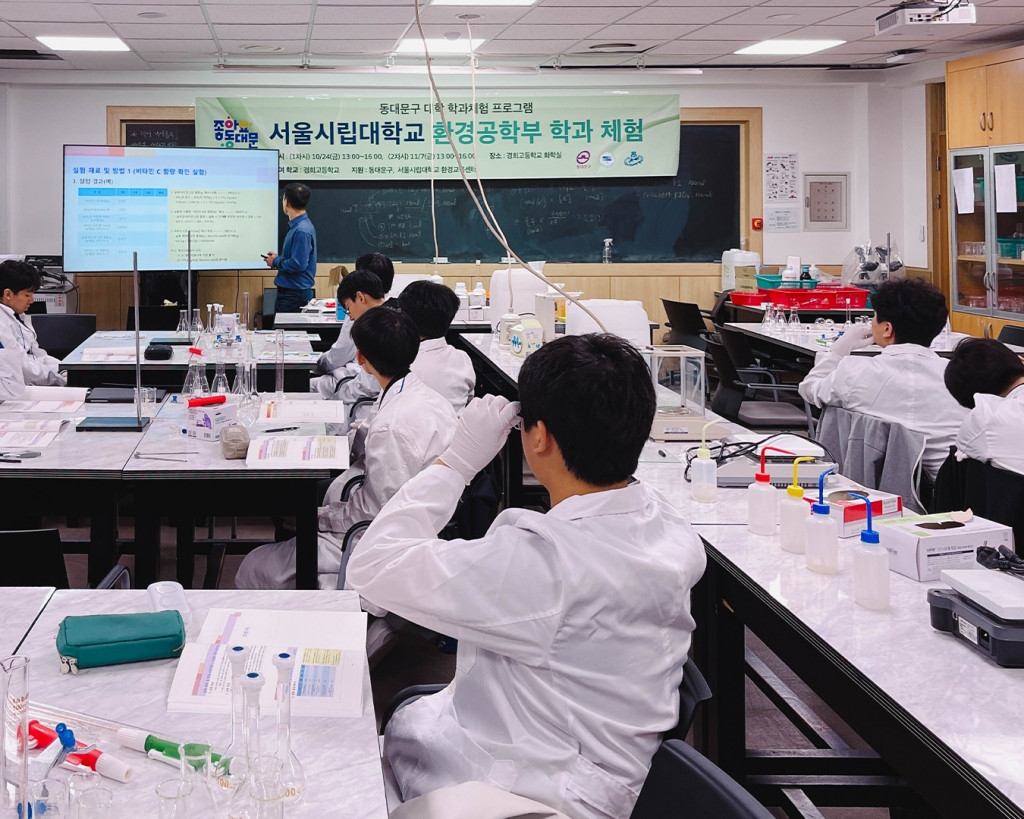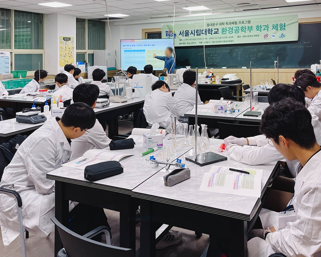 경희고등학교 Bio:Earth 환경 동아리를 비롯한 환경공학에 관심있는 학생들은 동대문구청이 주최하고 서울시립대 환경공학과에서 진행하는 학과 체험 활동에 참가해 관련 실험을 실시하며 환경 문제에 대한 해결책과 환경공학 진로에 대해 이해하는 시간을 가졌습니다.