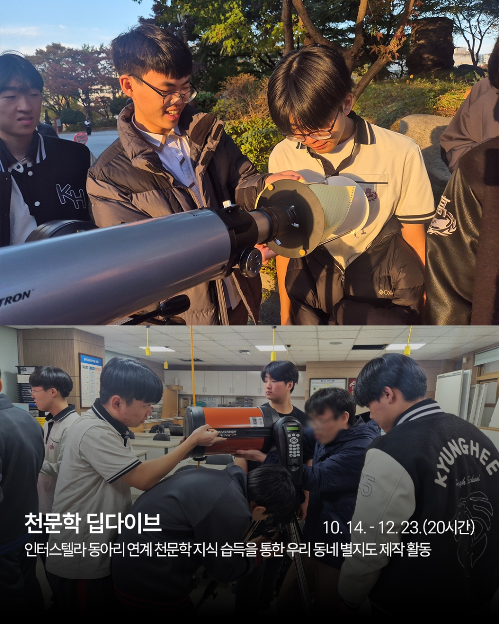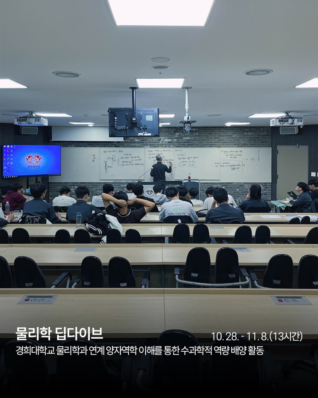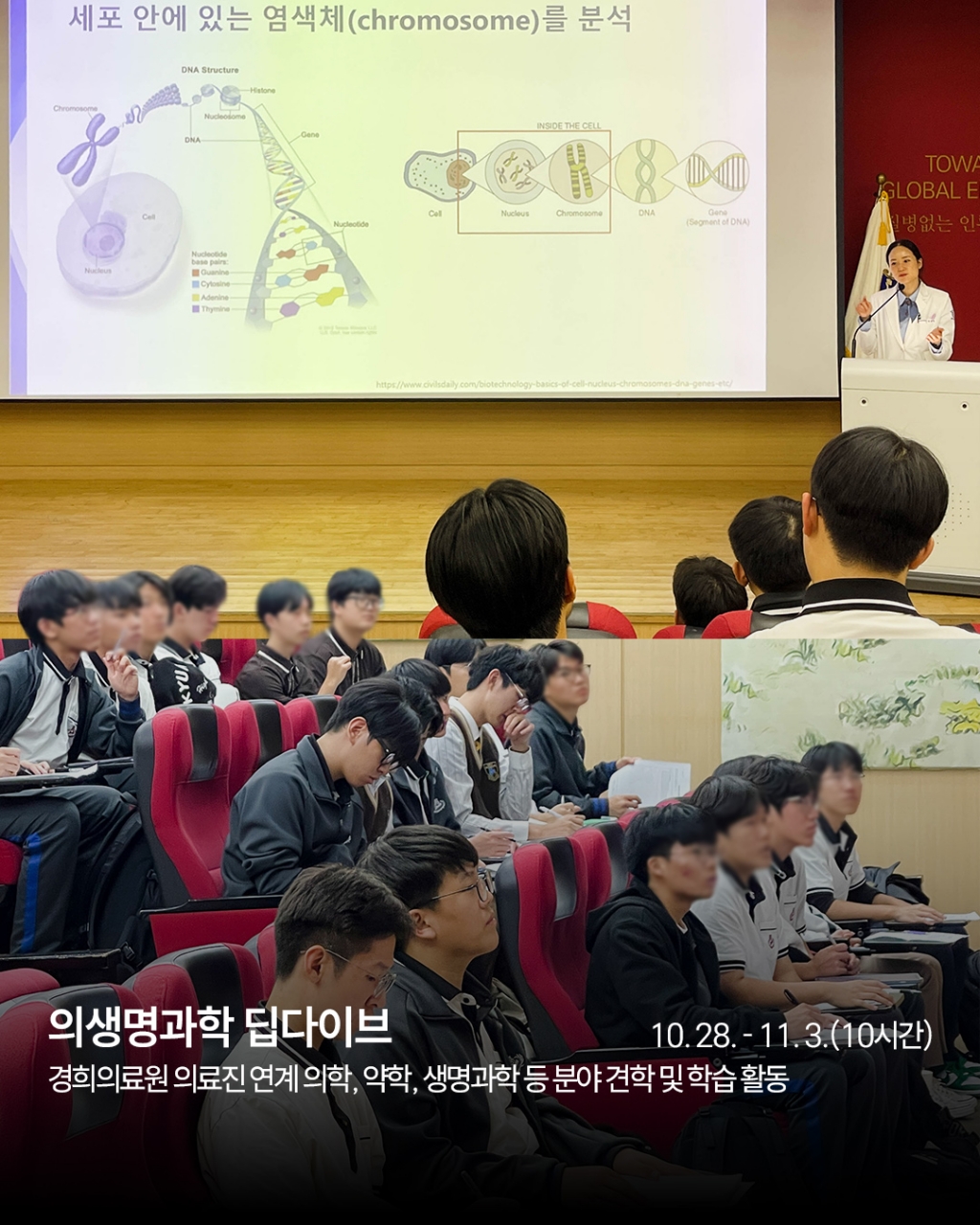 경희고등학교에서는 2학기를 맞이하여 좀 더 교과 활동 및 동아리 등 진로 특색에 맞는 딥다이브 프로그램을 개설, 운영하여 학생들의 최적의 학업, 진로 역량 계발 방안을 모색하고 있습니다. 각 프로그램 운영을 위해 인근 대학을 포함한 교육 기관, 전문가를 초빙하여 교육 목표에 적합한 활동을 제공하고 있습니다.