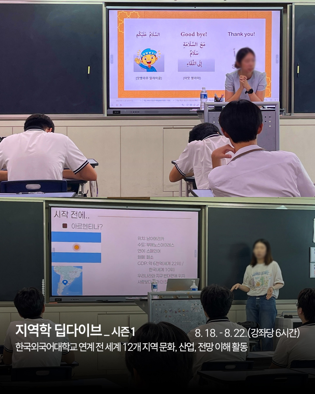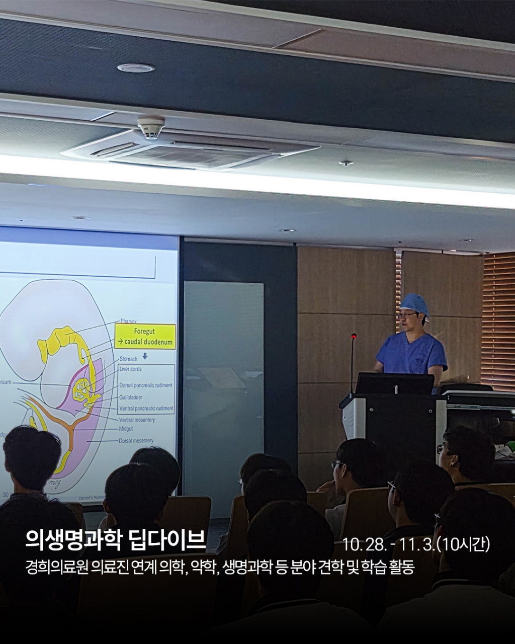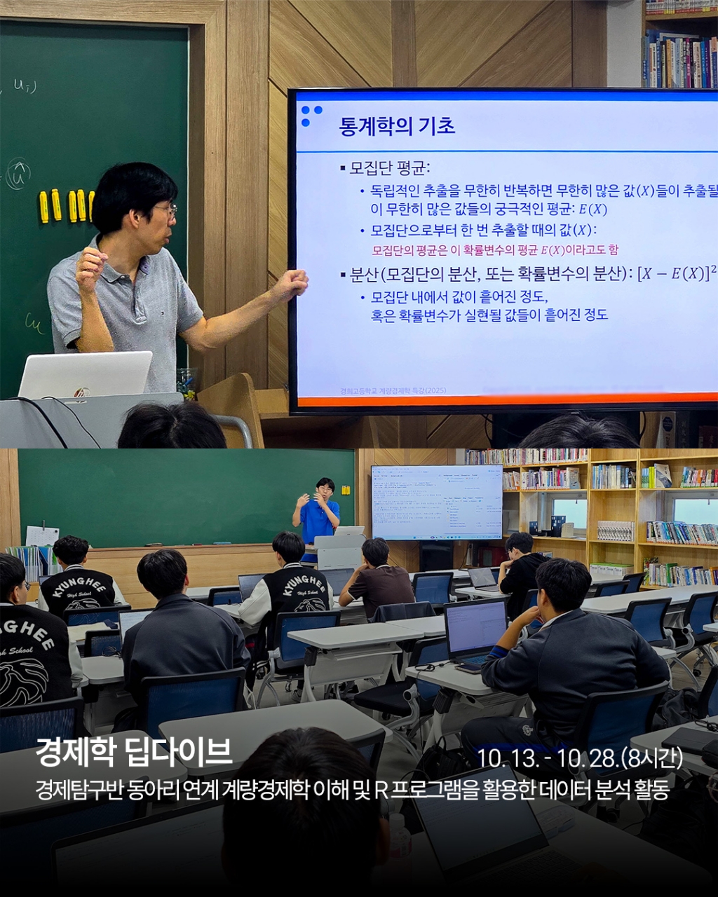 경희고등학교에서는 2학기를 맞이하여 좀 더 교과 활동 및 동아리 등 진로 특색에 맞는 딥다이브 프로그램을 개설, 운영하여 학생들의 최적의 학업, 진로 역량 계발 방안을 모색하고 있습니다. 각 프로그램 운영을 위해 인근 대학을 포함한 교육 기관, 전문가를 초빙하여 교육 목표에 적합한 활동을 제공하고 있습니다.