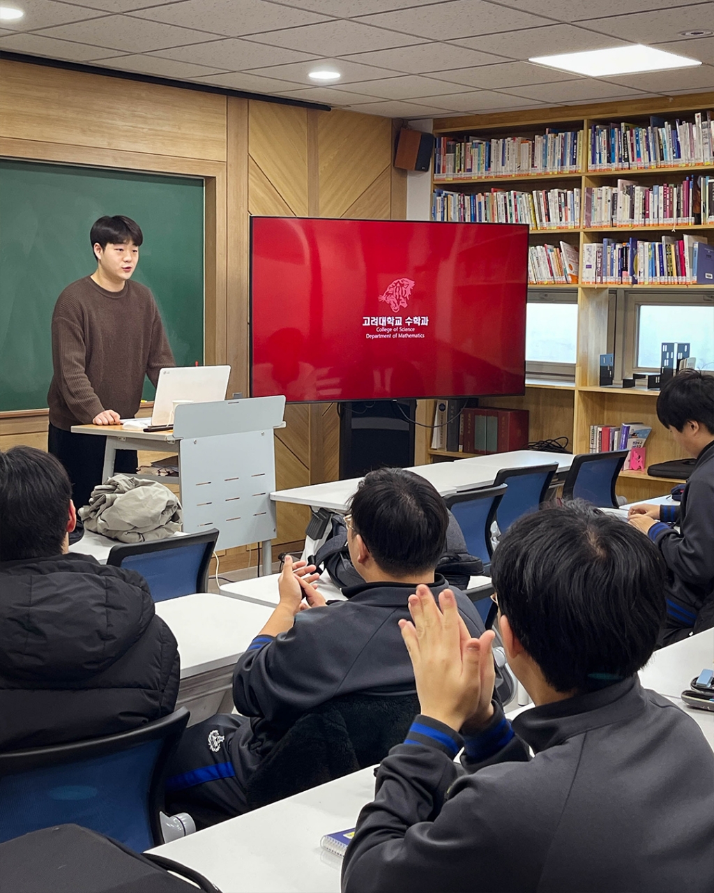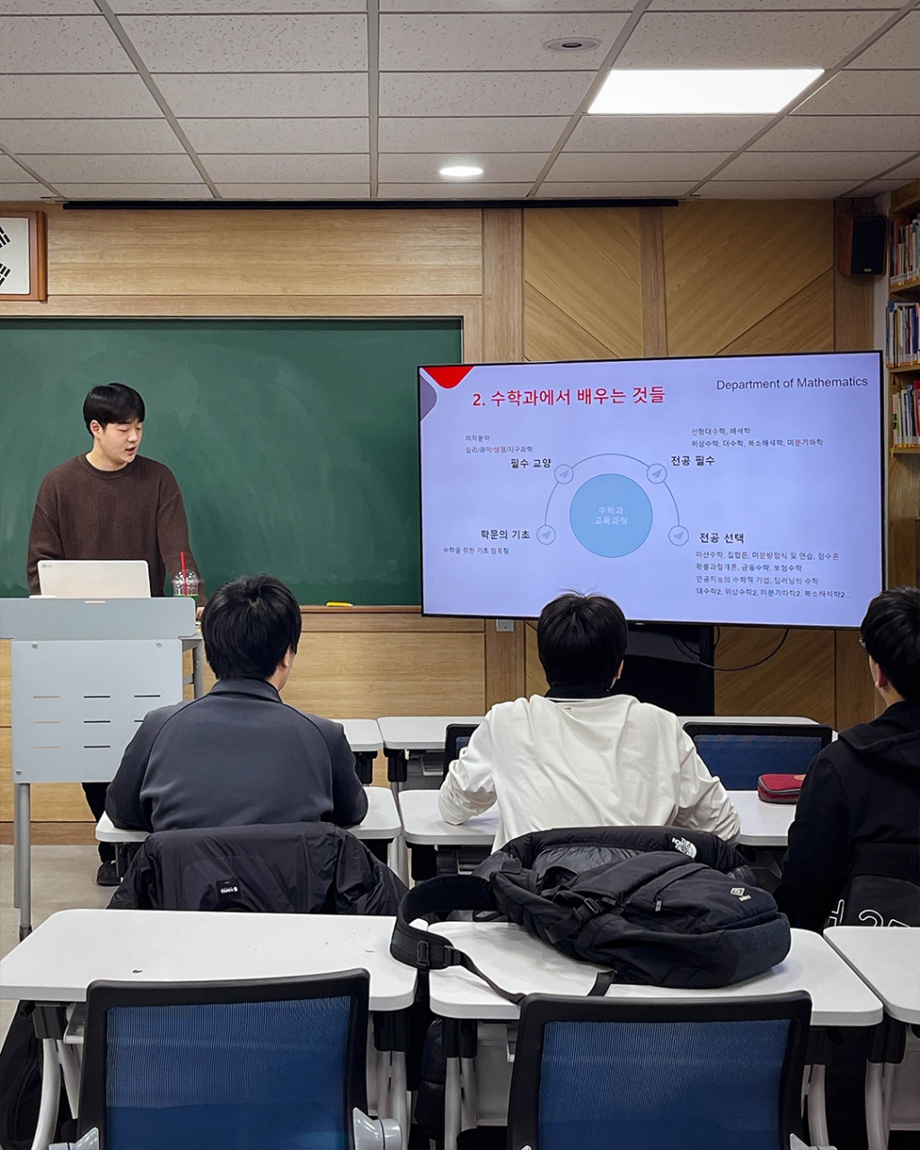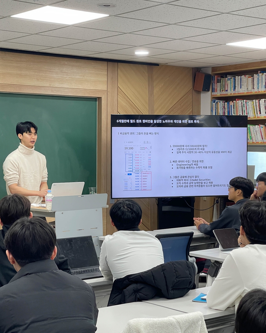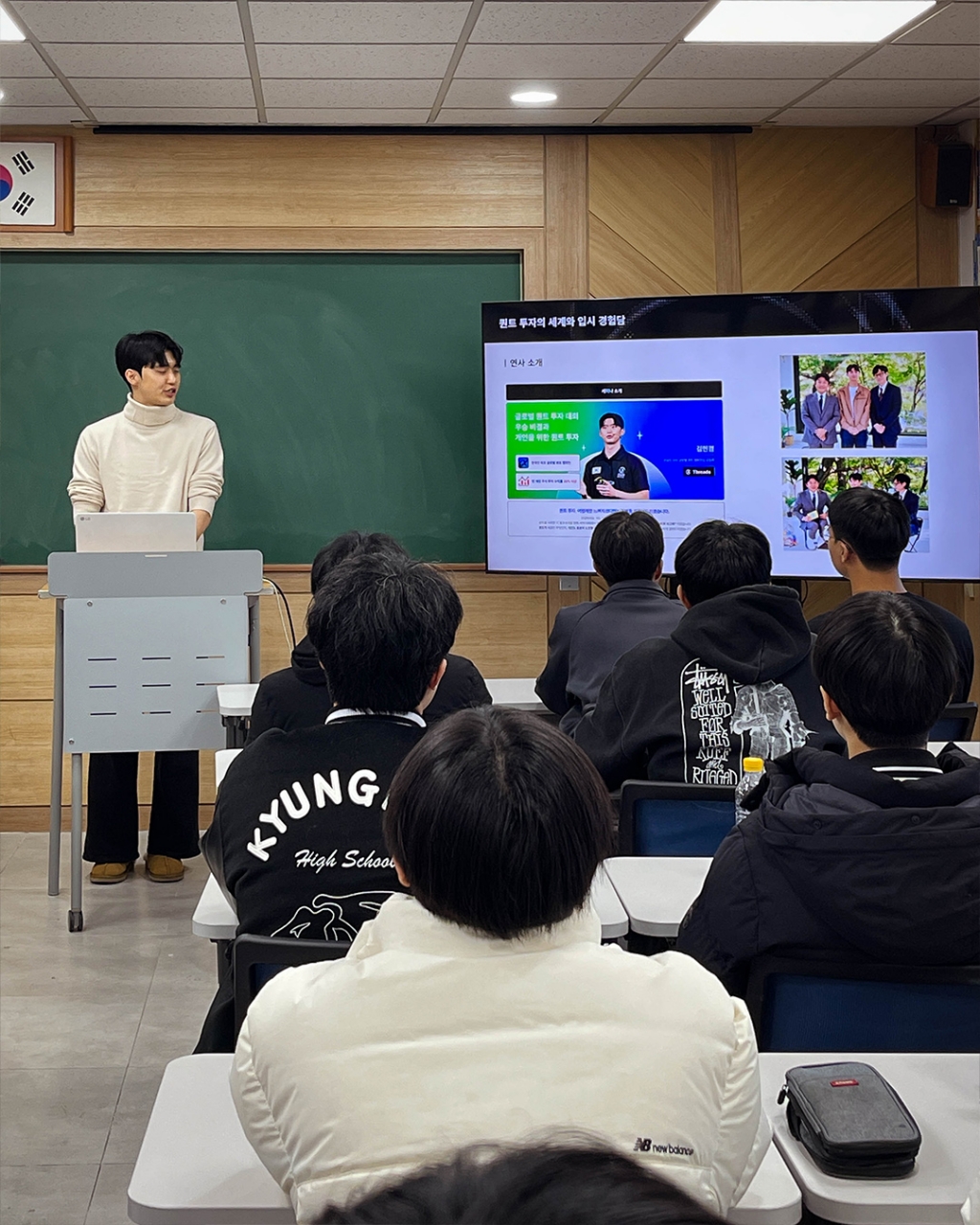 경희고등학교에서는 12월 22일 기말고사 이후 기간을 활용한 졸업생 특강을 진행하였습니다. 첫 특강 진행자로는 올해 세계 퀀트 챔피언십에서 한국인 최초 글로벌 챔피언을 차지한 UNIST 재학생 김민겸 님(58회 졸업생)이, 두번째 특강은 고려대학교 수학과에 재학 중인 안태규 님(60회 졸업생)이 수학 진로 특강을 진행했습니다. 대학에 진학한 선배들을 통해 학생들은 고등학교에서 목표로 하는 진로 계획이 대학에서 어떻게 확장되는지 가늠해보고, QnA를 통해 본인의 진로 및 학업 계획을 구체화하는 시간을 가졌습니다.