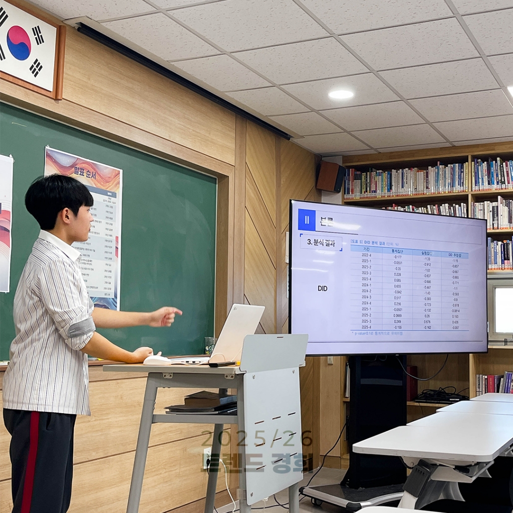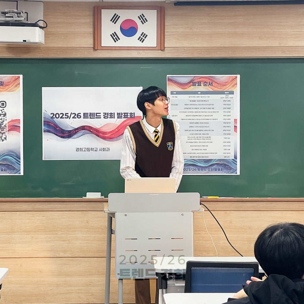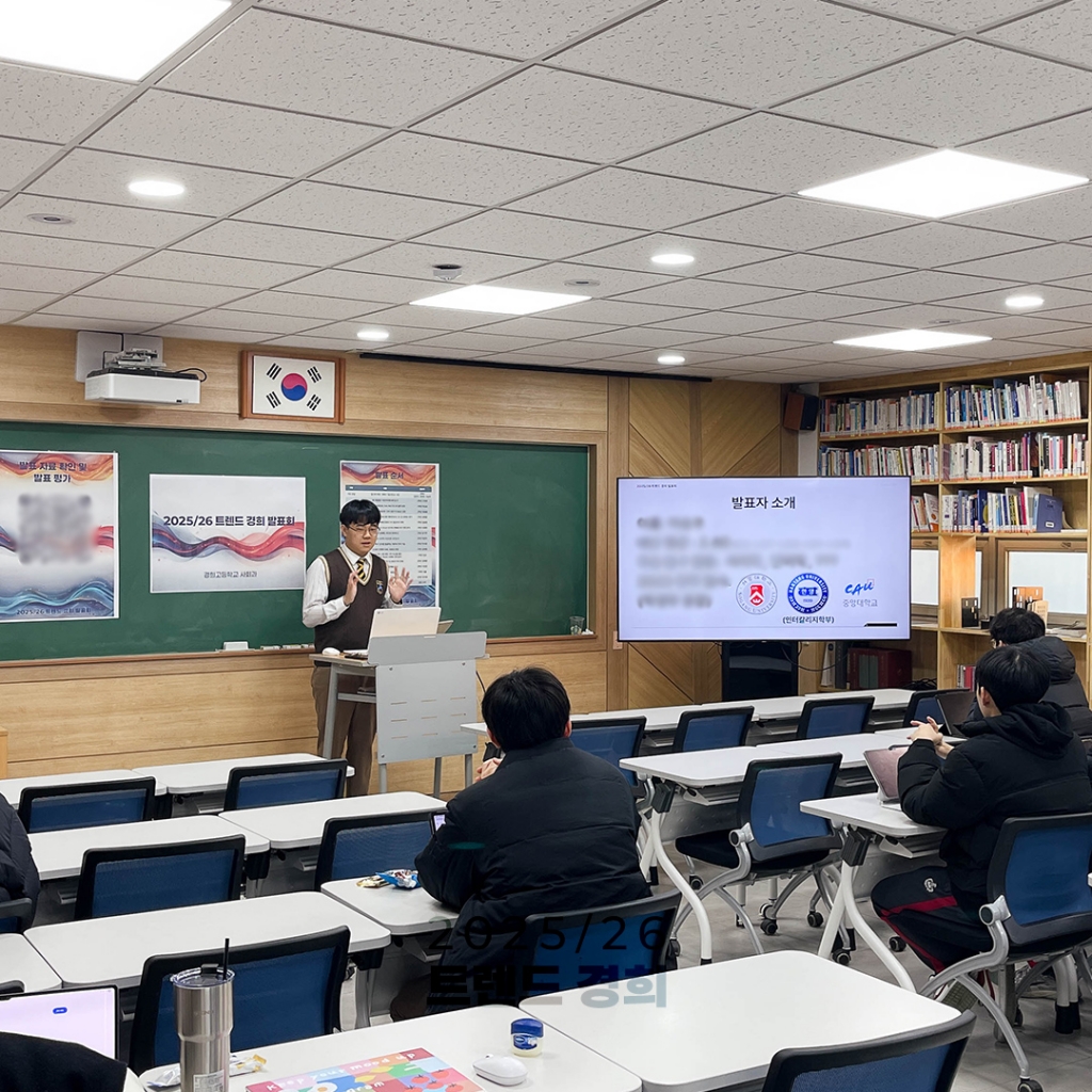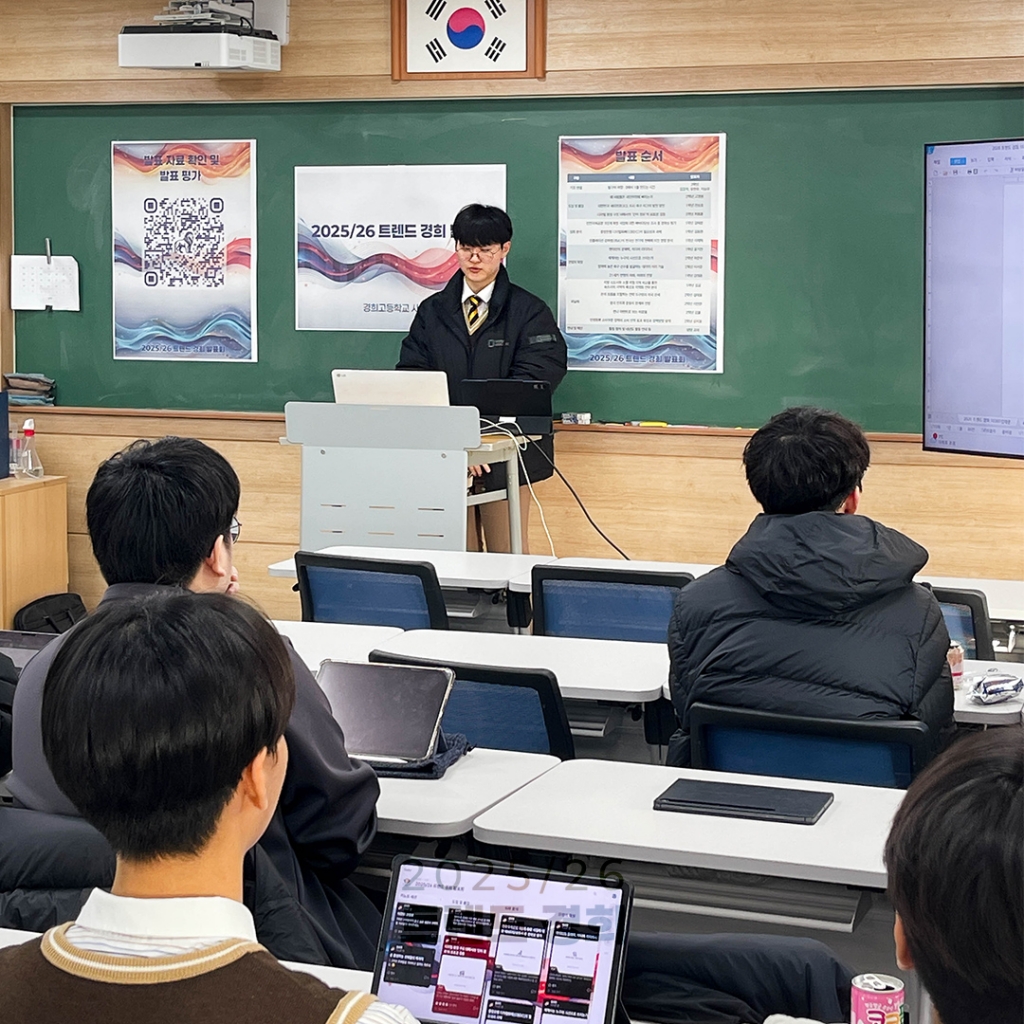 경희고등학교 사회과에서는 학생들이 포착한 우리 사회 변화를 토대로 2026년 이후 사회, 그리고 세계를 전망해보는 2026 트렌드 경희 발표회를 개최하였습니다. 2023년부터 활동에 참가하고 졸업하는 졸업생들의 키노트 세션을 시작으로, 1, 2학년 학생들이 연간 관심 주제를 중심으로 탐구한 사람들의 고립과 극단주의, 지역상권과 미국발 보호무역에 다른 경제 여건의 변동, 도시 개발과 소멸 지역의 활성화, 2022 개정 교육과정의 도입에 따른 교육 변화와 스포츠 산업의 변동 등 다양한 사회 문제를 대상으로 한 탐구 발표를 진행하였습니다.