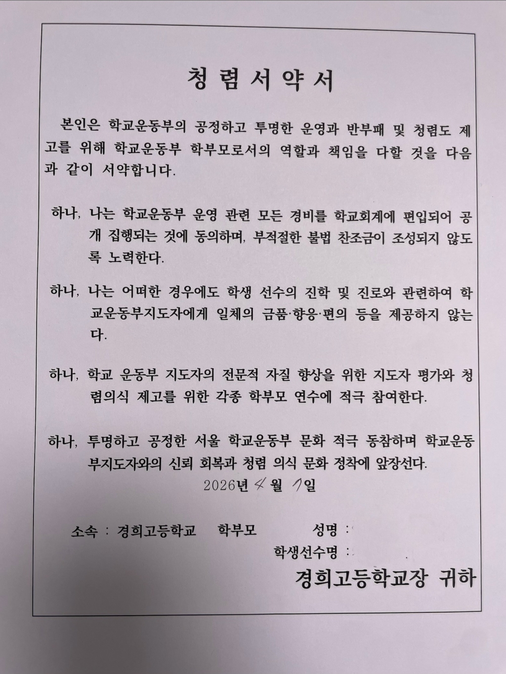 2026년 운동부 학부모 대상 청렴연수 실시(04.07.) 작성자 : 예술가 조회 : 69회 작성일 : 2026.04.07 21:08 신고 인쇄 스크랩 수정 답변 삭제 목록으로 댓글 0개 | 엮인글 0개