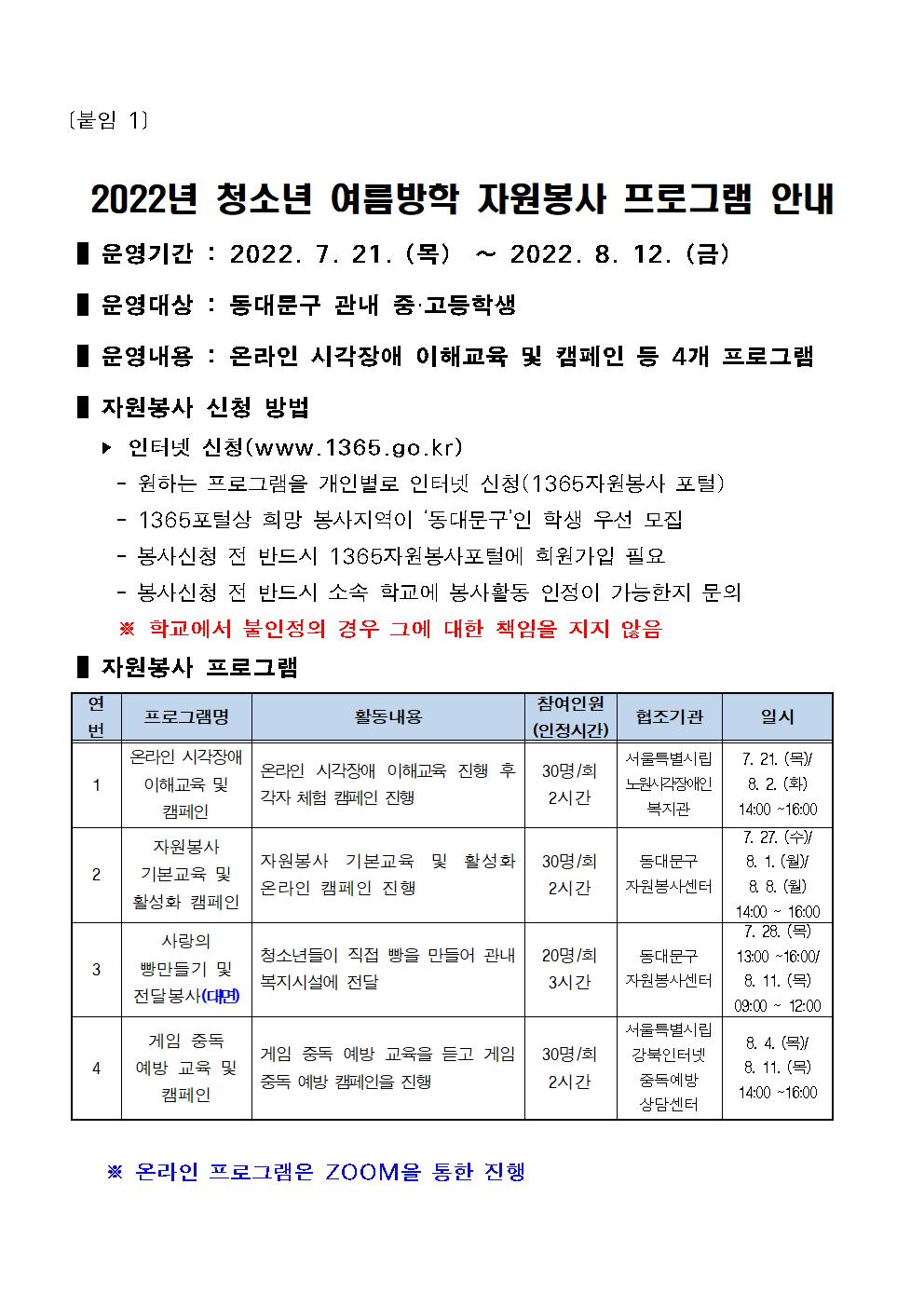 2022년 청소년 여름방학 자원봉사 프로그램 안내
