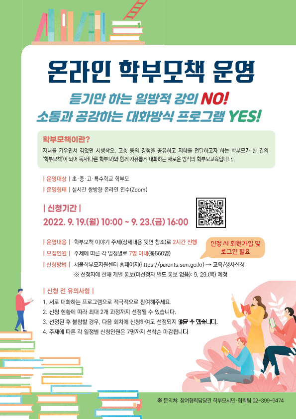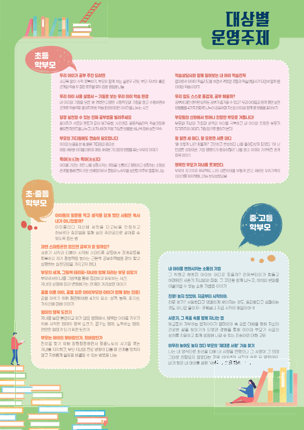 ◇ 신청방법: 서울학부모지원센터 홈페이지(https://parents.sen.go.kr) → 교육/행사신청