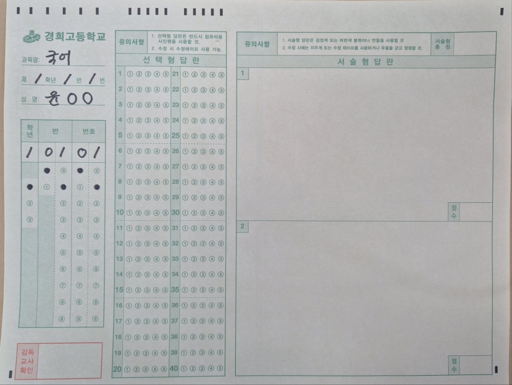 신입생 반 편성 배치고사 답안지 작성법 안내